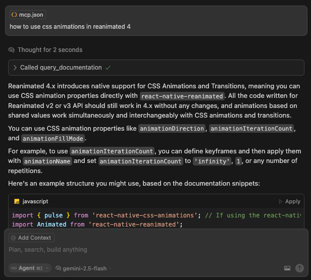 We index most React Native libraries along with their relevant documentation, versions, APIs, configuration details and usage patterns to provide additional and accurate context for your Agents.