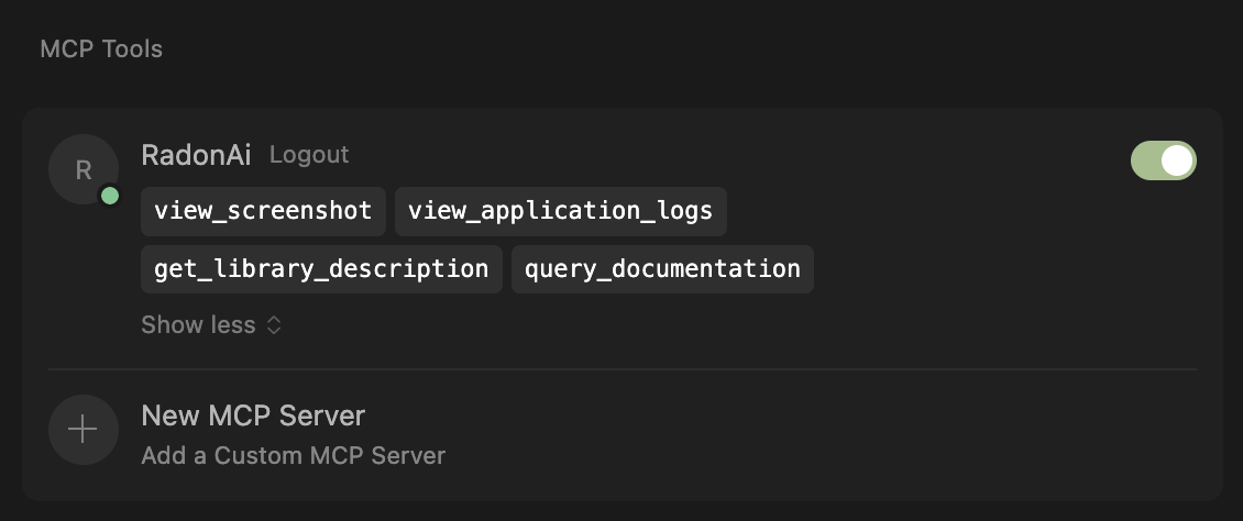 The Radon IDE automatically registers Radon AI tools in Cursor. You configure the Radon AI MCP tools from Cursor Settings. There, you can choose which tools are enabled or disable the MCP Radon toolset completely.