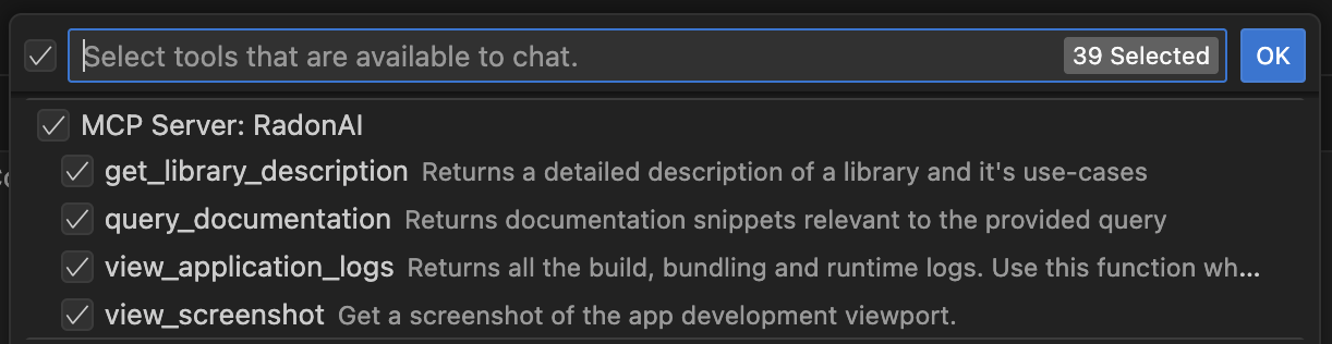 get_library_descriptionProvides a detailed description of a library and its use cases.query_documentationRetrieves documentation snippets relevant to a provided query.reload_applicationTriggers reload of the application. The AI may choose whether to restart the application process, reload just the JS bundle, or rebuild the entire app.view_application_logsReturns all the build, bundling and runtime logs available to Radon IDE. If the app builds and launches successfully, this tool will also attach a screenshot of the app.view_screenshotCaptures a device preview screenshot. Can help the agent with debugging issues and making UI adjustments. Currently only supported in GPT, Gemini and Claude models.view_component_treeDisplays the component tree of the running app. This tool allows the agent to gain a broad understanding of the project's structure.
